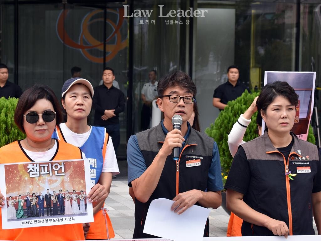 사무금융노조 보험설계사지부 한화생명지회(한화생명노동조합)는 이날 오전 10시 서울 장교동 한화빌딩 앞에서 “한화생명금융서비스 노조활동 탄압 중단 및 성실교섭 촉구 기자회견”을 개최했다.