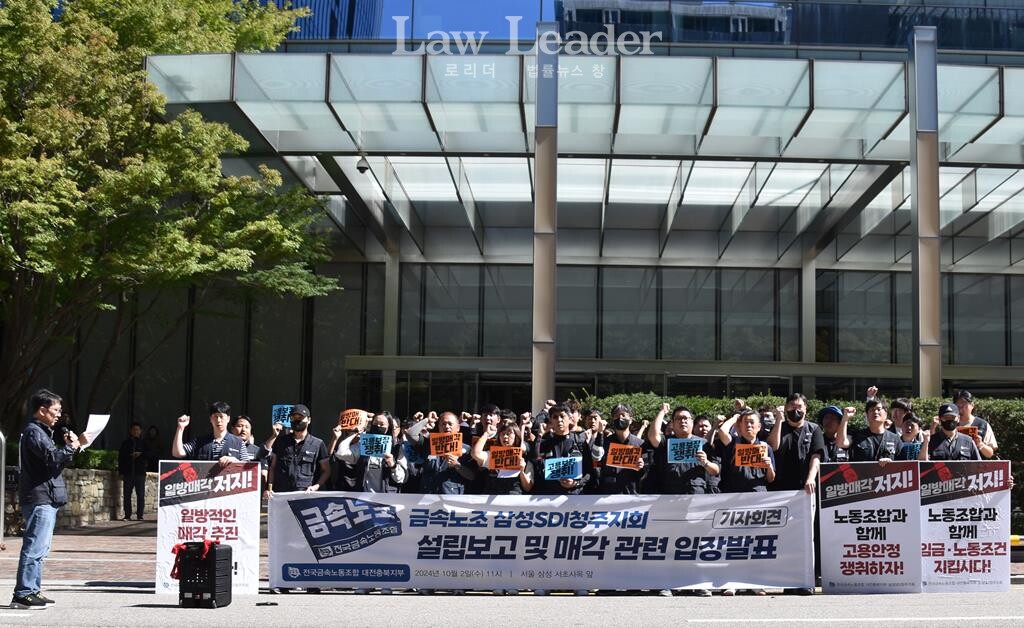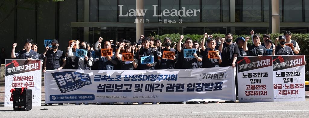 전국금속노동조합 대전충북지부와 삼성SDI청주지회는 2일 오전 11시 서울 서초동 삼성전자 서초사옥 앞에서 “금속노조 삼성SDI청주지회 설립 보고 및 매각 입장발표 기자회견”을 개최했다.