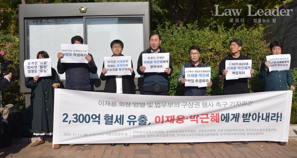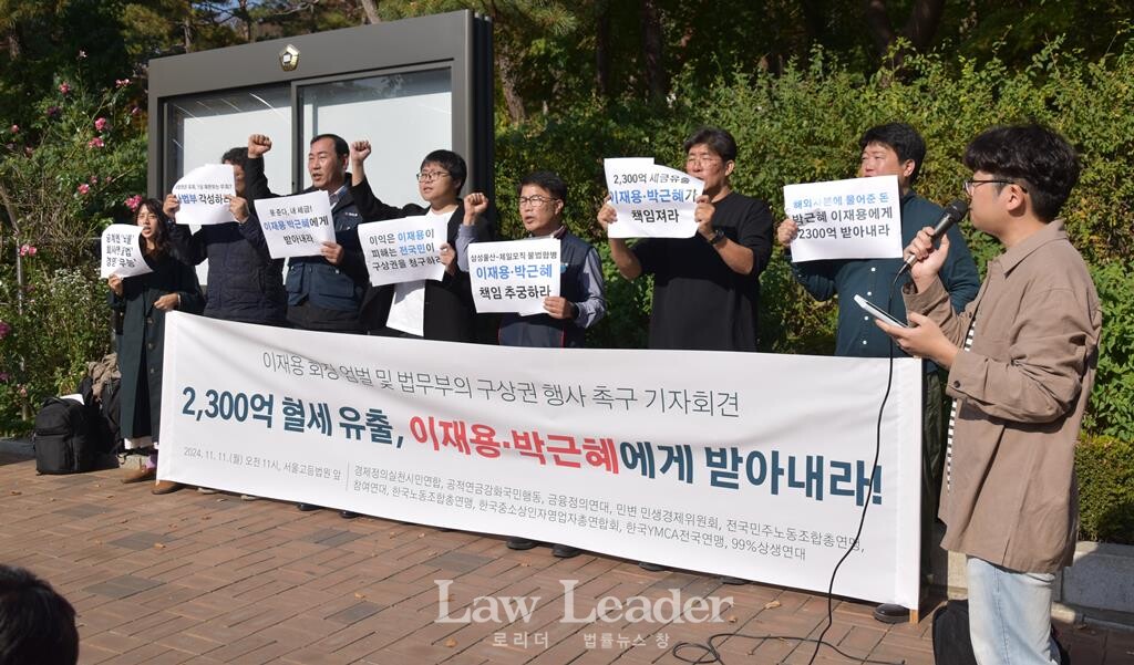경제정의실천시민연합(경실련), 공적연금강화국민행동, 금융정의연대, 민변(민주사회를 위한 변호사모임) 민생경제위원회, 전국민주노동조합총연맹(민주노총), 참여연대, 한국노동조합총연맹(한국노총), 한국중소상인자영업자총연맹, 한국YMCA전국연맹, 99%상생연대는 11일 서울 서초동 법원삼거리 서울고등법원 앞에서 ‘이재용 회장 엄벌 및 법무부의 구상권 행사 촉구 기자회견’을 개최했다.