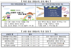 [로리더] 교육부, 법무부, 헌법재판연구원이 합심해 학생ㆍ교원 대상 헌법교육을 확대한다. 교육부는 헌법교육 특강을 지원한다고 18일 전했다. ▲법무부와 협력해 학생 대상 헌법 전문강의를 지원하고 ▲헌법재판연구원과 협력해 교원 대상 특강을 실시하는 내용이다. 학교 현장 헌법교육은 올 하반기에 시작됐다. 취지는 학생들에게 헌법의 가치를 정확히 알리고, 교원들에게는 헌법에 기반한 민주시민교육의 전문성을 강화하는 것이다.학생 대상 교육은 법무부 ‘2025년 헌법교육 전문강사 출장강의’의 일환이다. 학교의 신청을 받아 올해 초등학교 205곳