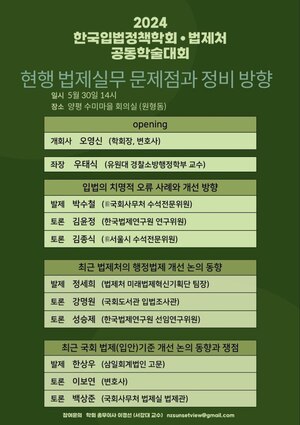 [로리더] (사)한국입법정책학회(학회장 오영신)와 법제처(처장 이완규)는 오는 5월 30일 오후 2시 경기도 양평군 수미마을 원형돔에서 ‘현행 법제실무 문제점과 정비 방향’을 주제로 공동학술대회를 진행한다.박수철 전 국회사무처 수석전문위원은 ‘입법의 치명적 오류 사례와 개선 방향’을 주제로 발표한다. 치명적 오류 입법의 사례를 다수 지적한다.[대표적 지적사례]- 조례의 제정ㆍ개정ㆍ폐지는 지방의회의 권한(지방자치법)임에도 시장, 군수 등에게 권한을 부여한 법률(도시 공업지역의 관리 및 활성화에 관한 특별법 제61조 제1항)- 지정권자