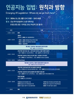 [로리더] 행정법이론실무학회(회장 김태호)와 한국법제연구원(원장 한영수)는 11월 22일 오후 1시 30분부터 서울 강남파이낸스센터 21층 대회의실에서 ‘인공지능 규제 입법: 원칙과 방향’을 주제로 학술 심포지엄을 개최한다.이 자리에서는 인공지능을 법으로 규제할 것인가에 대한 여러 법적ㆍ정책적 쟁점을 포괄적으로 정리하는 한편, 관련 최고 전문가들을 중심으로 다양한 의견들을 수렴함으로써 인공지능으로 인한 가능성과 위험에 대한 균형있는 해결점을 모색한다.전체사회는 김혜진 성균관대 교수가 진행한다. 개회사는 행정법이론실무학회 김태호 회장