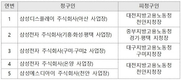 5건 취소 청구의 청구인은 삼성디스플레이(아산 사업장)이 대전지방고용노동청 천안지청장을 상대로, 삼성전자(기흥ㆍ화성ㆍ평택 사업장)가 중부지방고용노동청 경기ㆍ평택지청장을 상대로, 삼성전자(구미ㆍ구미2 사업장)가 대구지방고용노동청 구미지청장을 상대로, 삼성전자(온양 사업장)이 천안지청장을 상대로, 삼성에스디아이(천안 사업장)이 천안지청장을 상대로 낸 사건이다.