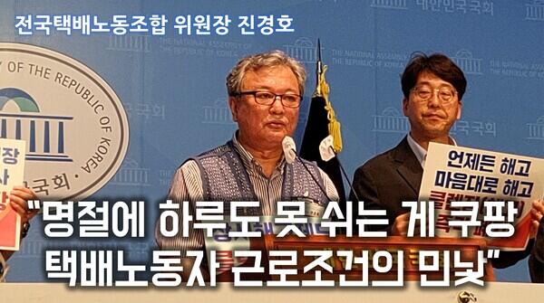 이날 국회 기자회견장에서 진경호 위원장은 “지난 토요일, 일요일, 월요일 3일 간의 연휴가 있었다. 3일 간의 연휴 동안, 쿠팡의 택배를 배송하는 쿠팡CLS(쿠팡로지스틱스서비스) 산하 택배 노동자들은 단 하루도 쉬지 못했다”고 전했다.