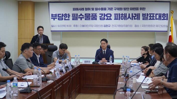 [로리더] 김한규 더불어민주당 국회의원이 22일 국회의원회관 제7간담회실에서 가맹본사의 갑질인 ‘프랜차이즈 필수물품 피해사례 발표대회’를 개최했다.