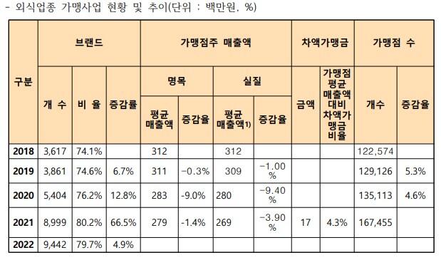 실제로 정종열 위원장이 제시한 ‘외식업종 가맹사업 현황’ 자료에 따르면 2018년 가맹점 수가 12만 2574개일 때, 가맹점주 실질 연평균 매출액은 3억 1200만원이었다. 그런데 2021년 가맹점 수가 16만 7455개로 급성장했음에도 가맹점주 실질 연평균 매출액은 2억 6900만원으로 오히려 감소했다. 이는 가맹점 수 증가와 가맹점주 실질 연평균 매출액이 반비례하고 있음을 보여준다고 했다.