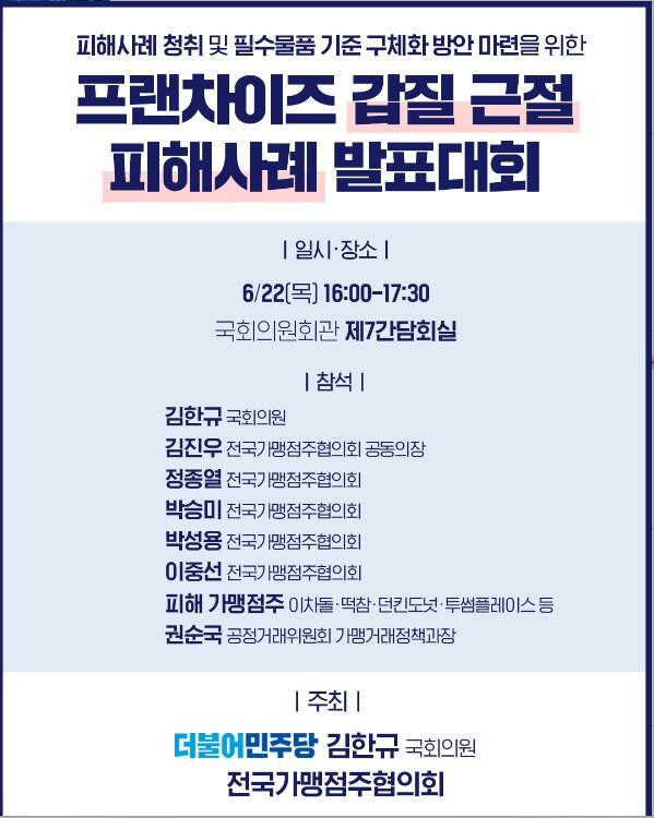 프랜차이즈 필수물품 피해사례 발표 자리를 마련한 김한규 국회의원은 “공정위가 부당하게 필수물품이 선정되지 않도록 가맹본부를 감독하는 게 중요하다”며 공정위의 역할을 강조했다.