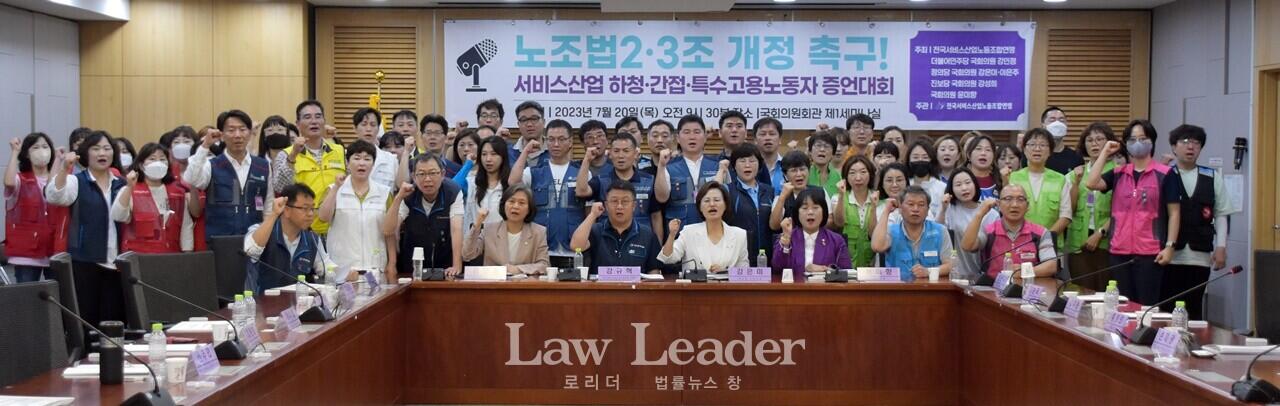 전국서비스산업노동조합연맹, 강민정 더불어민주당 국회의원, 강은미ㆍ이은주 정의당 국회의원, 강성회 진보당 국회의원, 윤미향 국회의원은 이날 국회의원회관 제1세미나실에서 ‘노조법 2ㆍ3조 개정 촉구! 서비스산업 하청ㆍ간접ㆍ특수고용노동자 증언대회’를 개최했다.