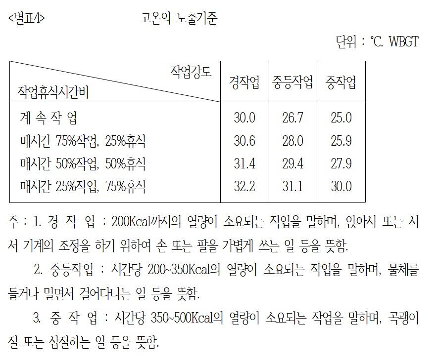 조건희 상임활동가는 “‘더 힘들게 일하니까 더 오래 쉬어야지’라는 것은 정말 당연한 명제”라며 “노동부고시 제2002-8호 ‘화학물질 및 물리적 인자의 노출기준’ 별표4의 ‘고온의 노출 기준’도 그러한 기조를 제시하고 있기도 하다”고 예시를 들었다.