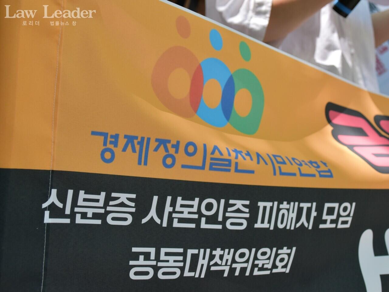 경제정의실천시민연합(경실련)과 신분증 사본인증 피해자모임 공동대책위원회는 이날 금감원에 비대면 신분증 사본인증에 기한 전자금융실명거래 오류사고의 권리규제를 위한 분쟁조정을 요구하는 기자회견을 개최했다.