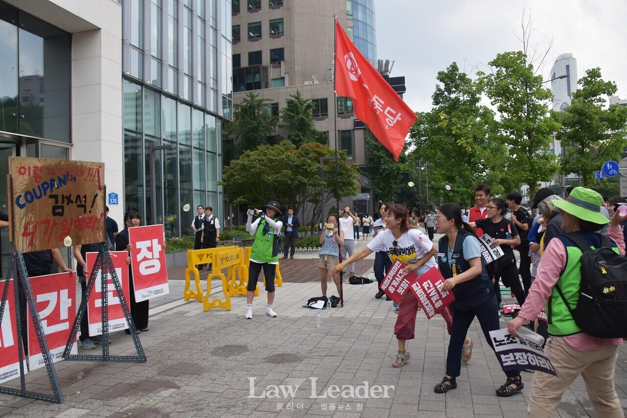 특히 이날 결의대회에 참여한 쿠팡 노동자들은 “휴게 시간 보장”을 촉구하면서 “이렇게 더운데 쿠팡 김범석 니가 일해라”라고 적힌 판자에 물풍선을 던지는 퍼포먼스를 벌였다.