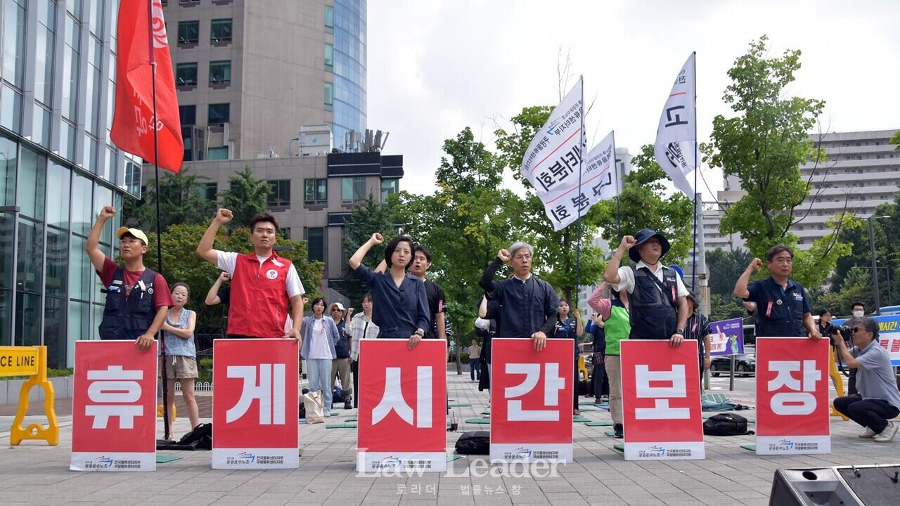 노조는 “지난 8월 1일, 산업안전보건기준에 관한 규칙 제566조 및 고용노동부 가이드라인에 따른 폭염 시기 휴게시간 보장을 요구하며 하루 파업을 진행했다”며 “8월 2일부터는 현장에서 체감온도 33℃일 경우 매시간 10분, 체감온도 35℃일 경우 매시간 15분 쉬어가는 현장 준법 투쟁을 이어가고 있다”고 설명했다.