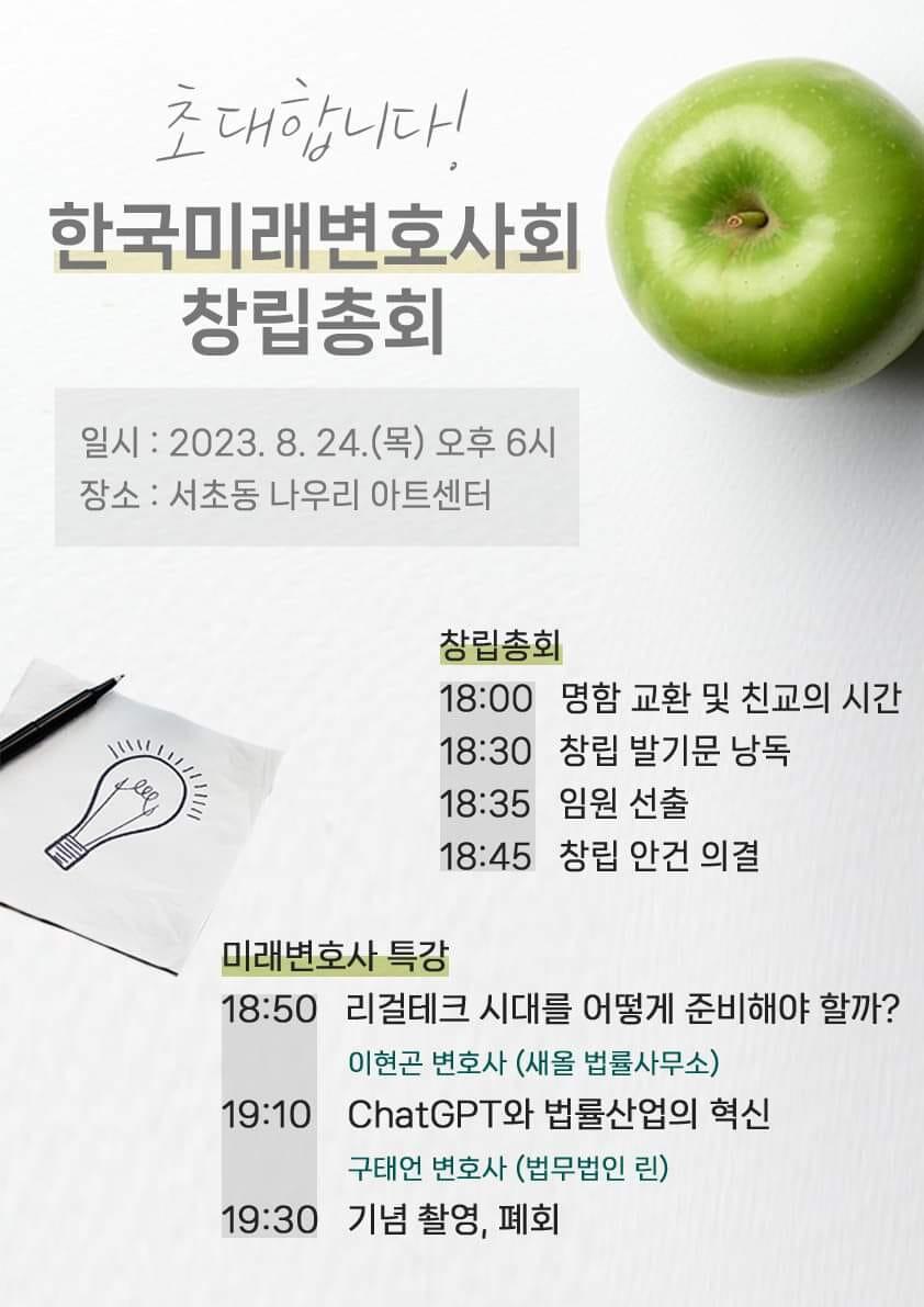 이번 창립총회에 이어 이현곤 변호사(새올 법률사무소)가 “리걸테크 시대를 어떻게 준비해야 할까?”를 주제로, 구태언 변호사(법무법인 린)가 “ChatGPT와 법률산업의 혁신”을 주제로 강단에 설 예정이다.