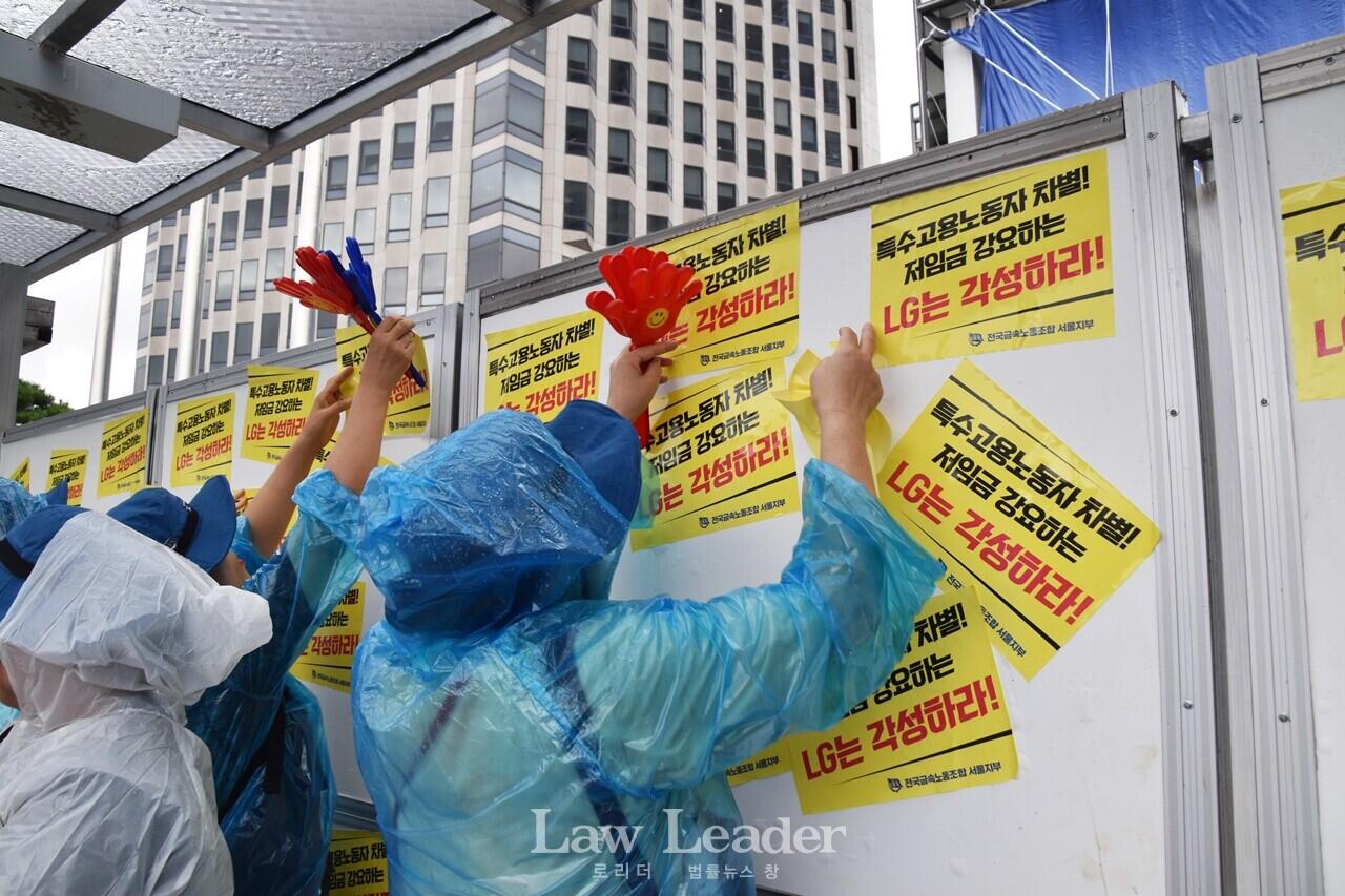 현대자동차 판매비정규직 노동자와 LG전자 방문점검노동자들은 이날 여의도 LG트윈타워(1부)와 국회(2부) 앞에서 ‘특수고용노동자 공동투쟁의 날’ 집회를 열고, 기업에는 노동자 존중, 국회에는 노조법 2ㆍ3조 개정안(노란봉투법) 통과를 촉구했다.