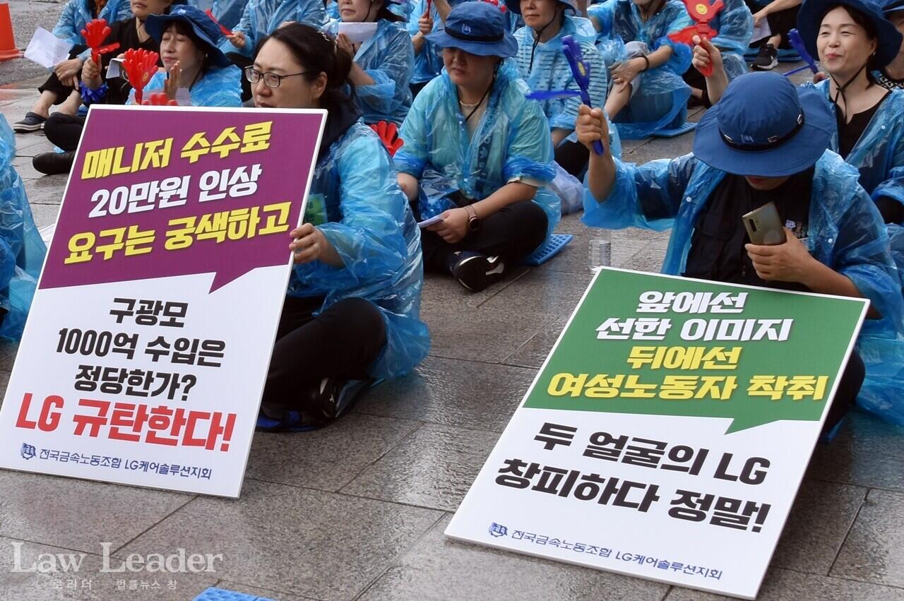 이날 LG케어솔루션 조합원들은 LG를 비판하는 판넬을 많이 갖고 집회에 참석했다. 특히 “매니저 수수료 20만원 인상 요구는 궁색하고, 구광모(LG그룹 회장) 1000억 수입은 정당한가?”라고 묻는 판넬도 보였다.