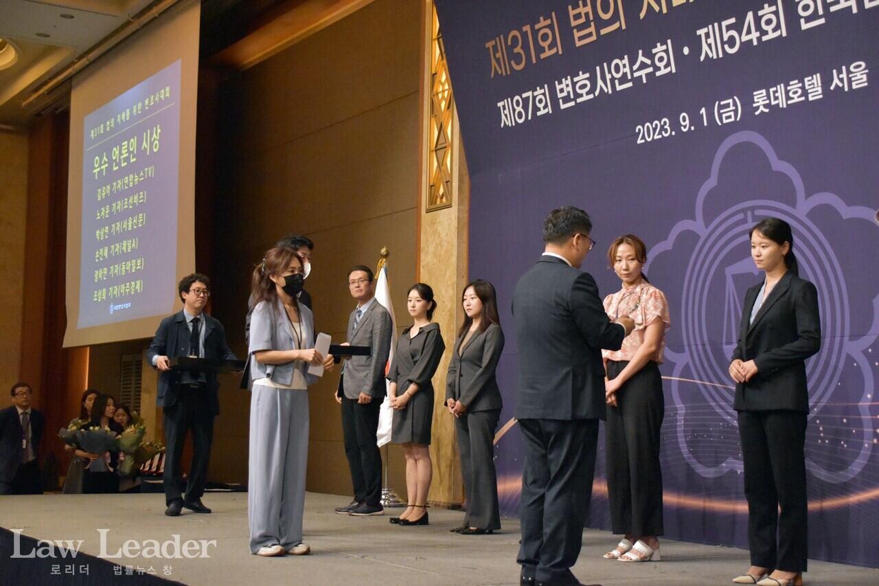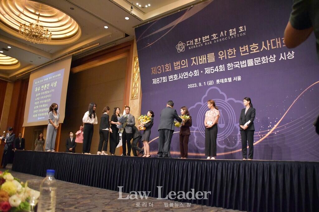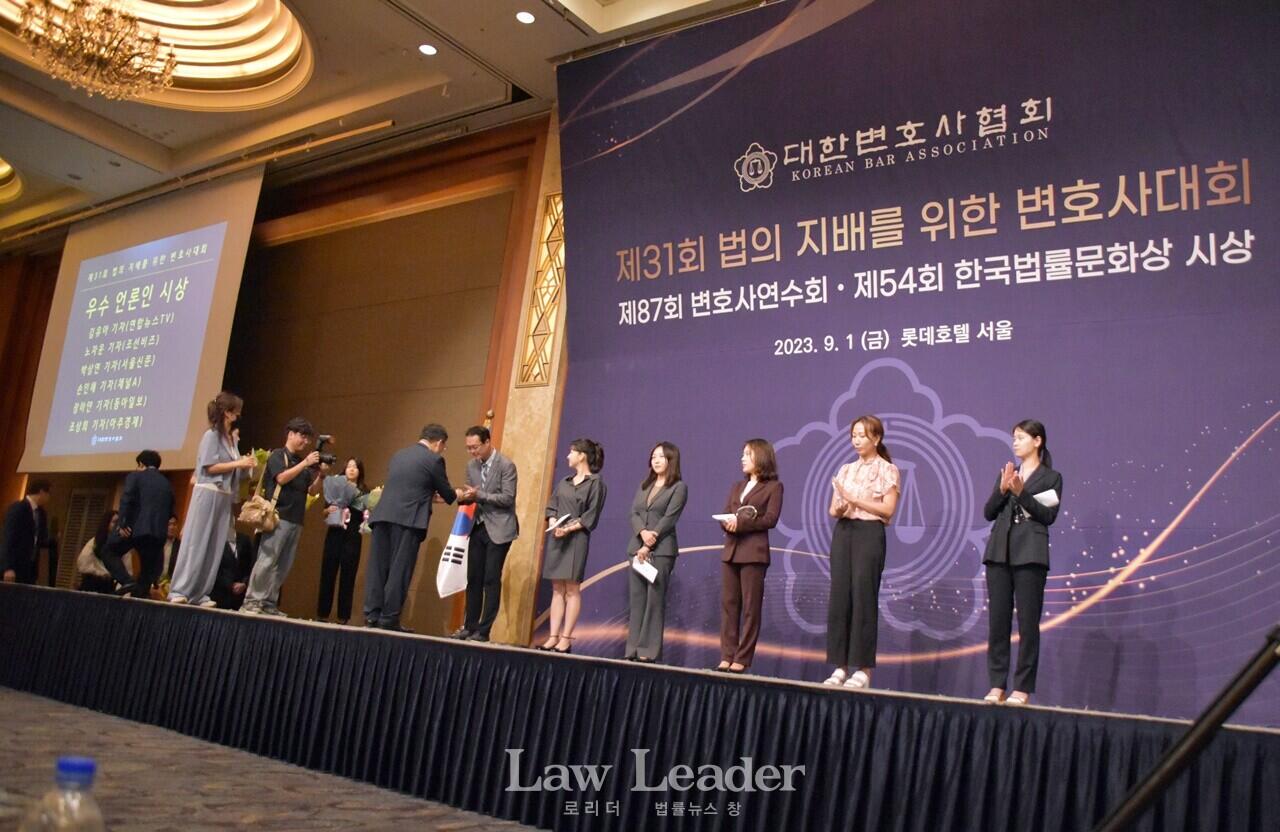 [로리더] 대한변호사협회(협회장 김영훈)는 9월 1일 서울 소공동 롯데호텔에서 개최된 2023년도 ‘제31회 법의 지배를 위한 변호사대회’에서 우수언론인상을 시상했다.