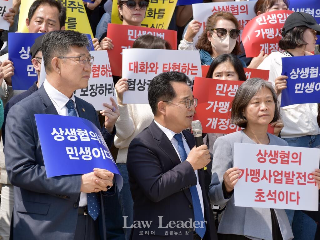 이날 연대발언을 위해 기자회견에 참석한 민병덕 더불어민주당 국회의원은 “지난해(2023년) 국감을 하면서 ‘100개의 법보다 한 번의 만남이 더 중요하다’는 말을 들었다”면서 “국감 도중에는 증인이라는 수단을 써서 압박하니까 그동안 안 만났던 가맹점주와 가맹본사 간의 만남이 이뤄졌고, 그 몇 개월 동안의 만남 속에서 10년 간 묵었던 사안들이 해결되기도 했다”는 일화를 소개했다.