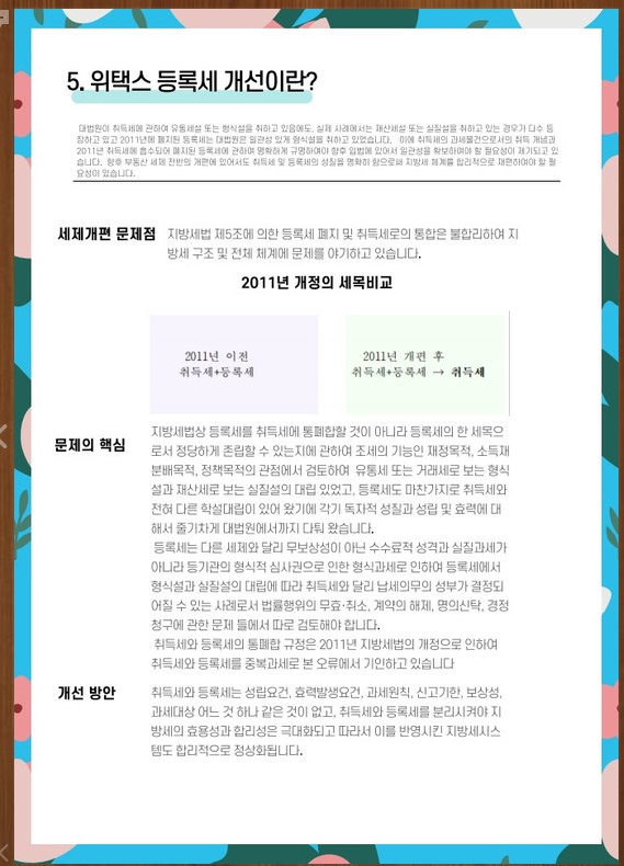 이종근 후보는 개선방안으로 “취득세와 등록세는 성립요건, 효력발생요건, 과세원칙, 신고기한, 보상성, 과세대상 어느 것 하나 같은 것이 없고, 취득세와 등록세를 분리시켜야 지방세의 효용성과 합리성은 극대화되고 따라서 이를 방영시킨 지방세시스템도 합리적으로 정성화된다”고 했다.