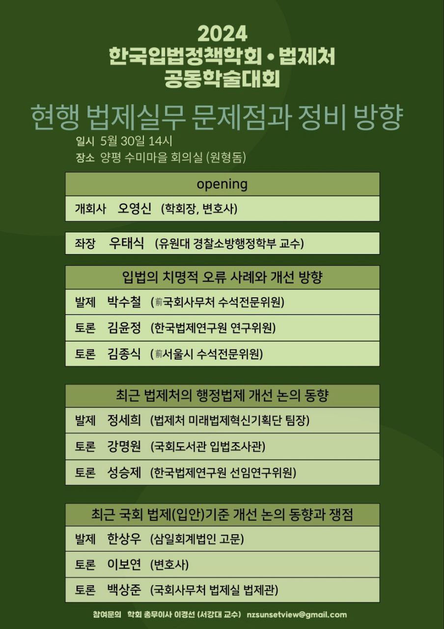 [로리더] (사)한국입법정책학회(학회장 오영신)와 법제처(처장 이완규)는 오는 5월 30일 오후 2시 경기도 양평군 수미마을 원형돔에서 ‘현행 법제실무 문제점과 정비 방향’을 주제로 공동학술대회를 진행한다.