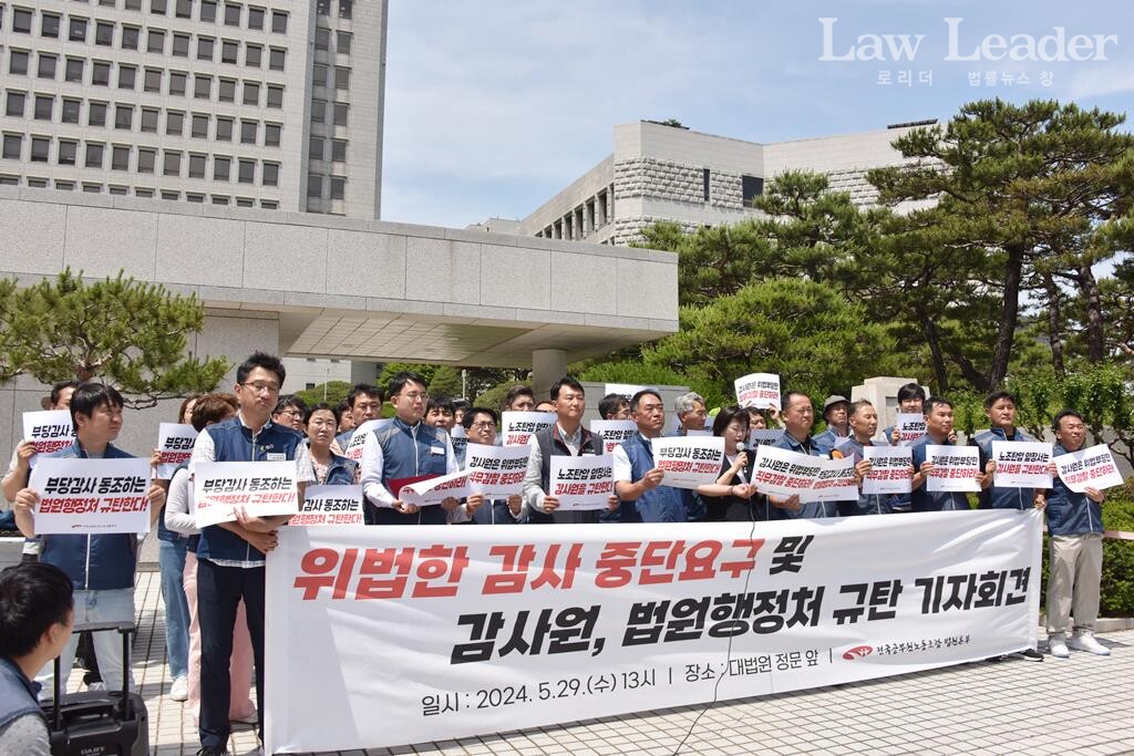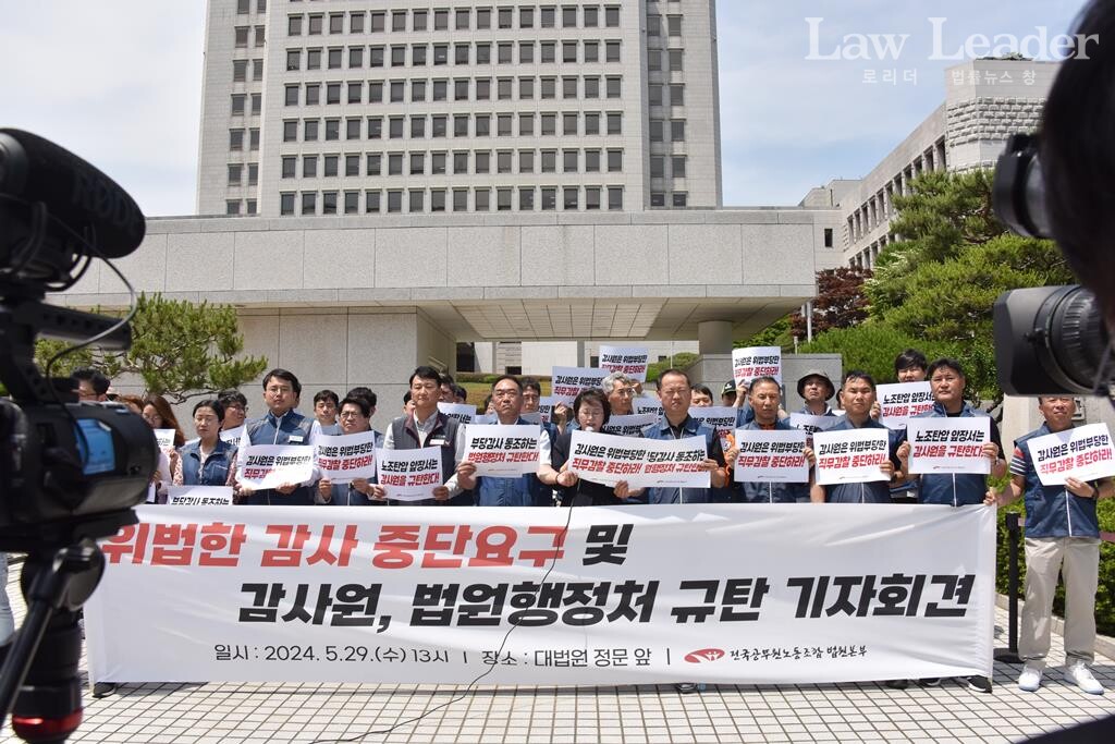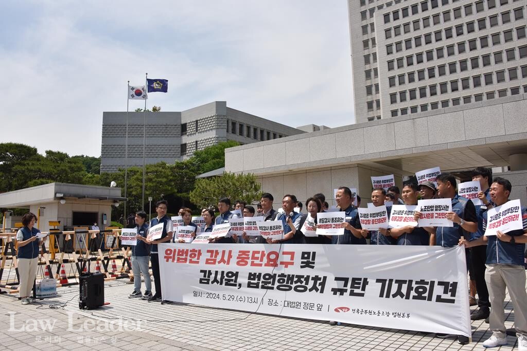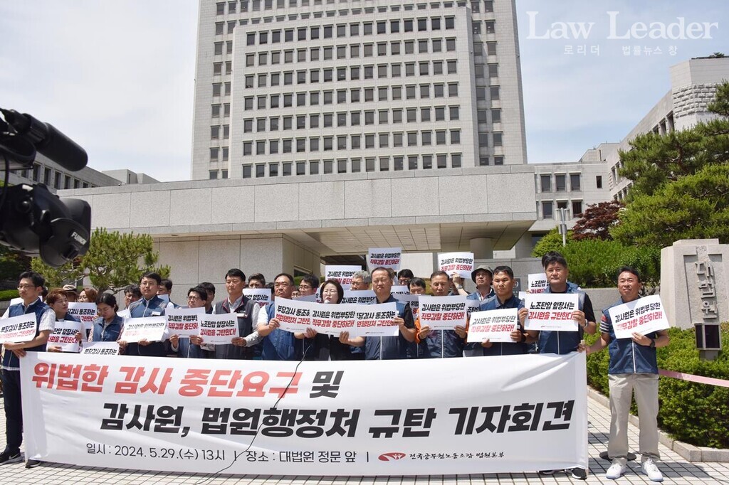 전국공무원노동조합 법원본부(본부장 이성민)는 지난 5월 29일 서울 서초동 대법원 청사 앞에서 “위법한 감사 중단 요구 및 감사원, 법원행정처 규탄 기자회견”을 개최했다.