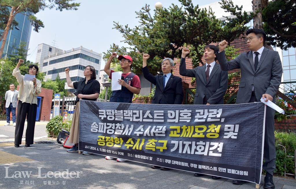 쿠팡 노동자의 건강한 노동과 인권을 위한 대책위원회(쿠팡대책위), 쿠팡 민변(민주사회를 위한 변호사모임) 법률대응팀은 이날 오전 10시 30분 서울 송파경찰서 앞에서 쿠팡 블랙리스트 의혹 관련 수사관 교체요청 및 공정한 수사 촉구 기자회견을 개최했다.