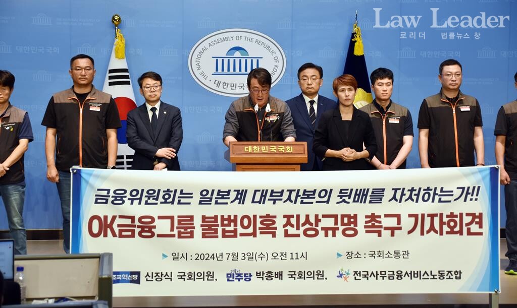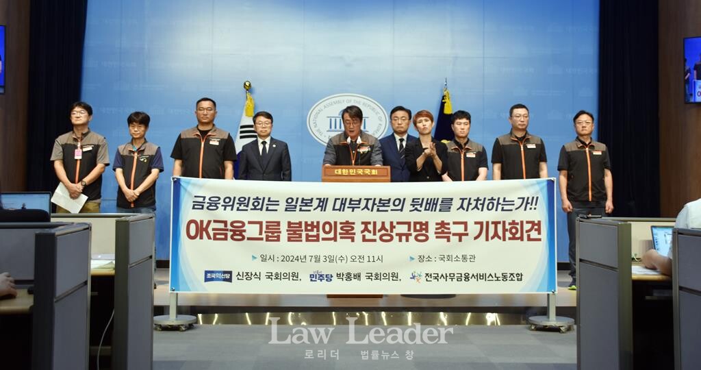 신장식 조국혁신당 국회의원, 박홍배 더불어민주당 국회의원, 전국사무금융서비스노동조합과 OK금융그룹지부(지부장 봉선홍)는 3일 오전 11시 국회소통관에서 “OK금융그룹 불법 의혹 진상규명 촉구 기자회견”을 개최했다.