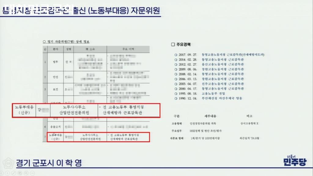 [로리더] 국회 환경노동위원회 소속 이학영 더불어민주당 국회의원은 15일 국정감사에서, 한화오션에서 일어난 32m 추락 산업재해 사고와 관련해 내려진 작업중지 명령이 별다른 개선점 없이 해지된 것을 두고 “최근에 통영지청 근로감독관 출신 자문위원이 한화오션의 ‘노동부 대응’으로 이직했다”며 로비를 의심했다.