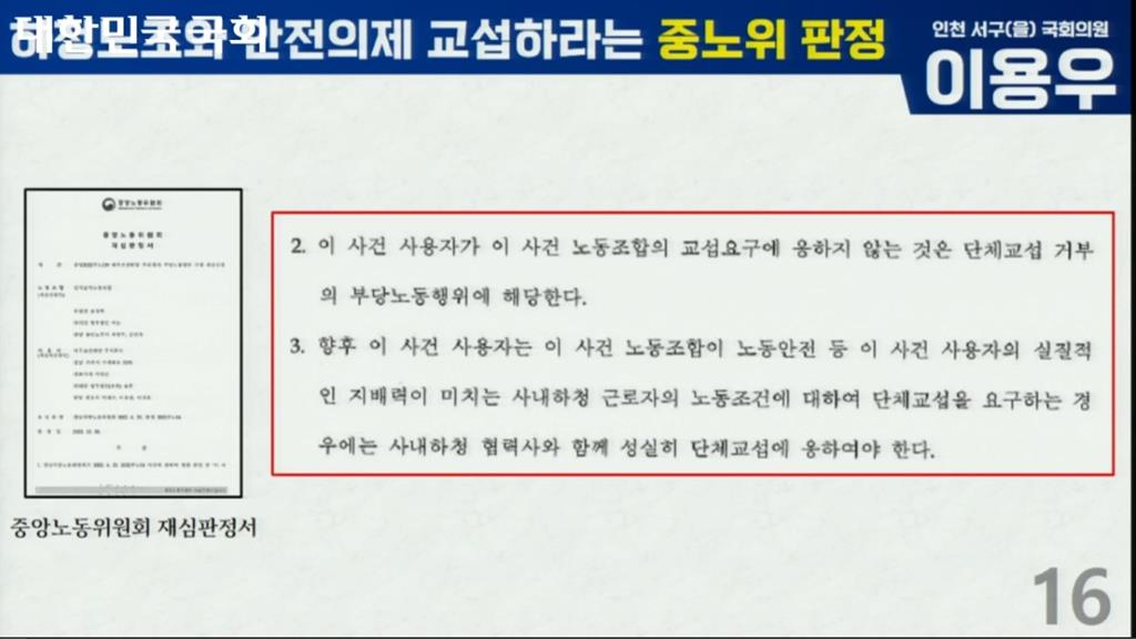 이용우 국회의원은 “2022년 12월 중앙노동위원회 판정으로 한화오션, 당시는 대우조선해양이 원청으로서 하청 노조와 산업안전의제를 포함해 교섭에 응해야 한다고 했다”며 “그리고 교섭 요구에 응하지 않은 것은 단체교섭 거부로 부당노동행위 판정을 받았다”고 전했다.