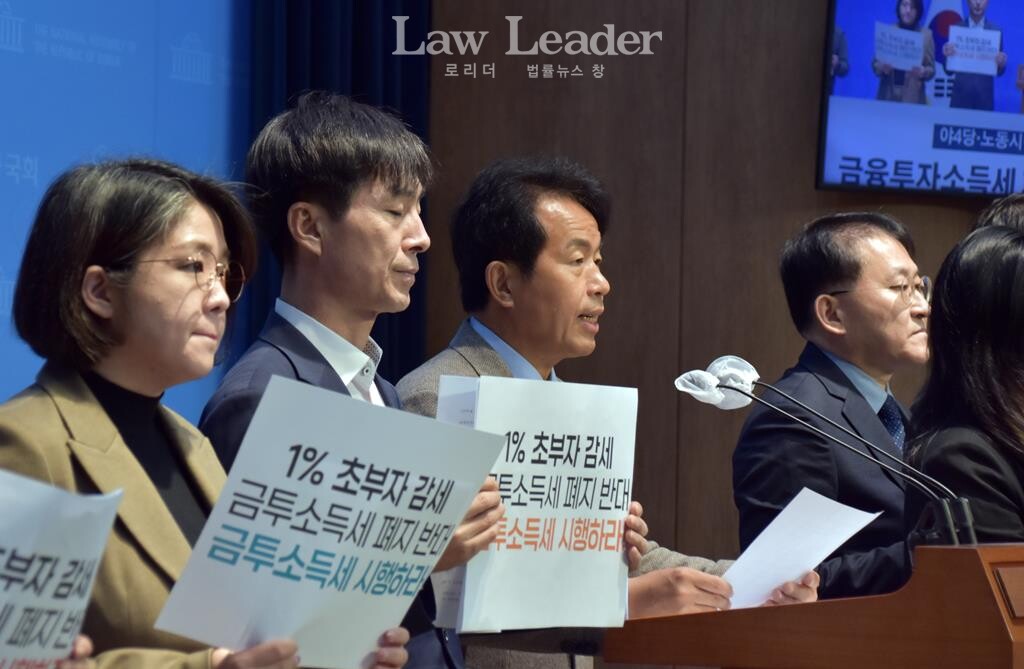 윤종오 의원은 “평범한 서민은 꿈꾸기 어려운 자본 이득을 벌어들이는 기득권층은 금융투자소득세 폐지를 위해 온갖 거짓 선동을 벌여왔다”며 “금융투자소득세 적용 대상이 극소수라는 것을 뻔히 알면서도 1400만 개미 투자자를 내세웠다”고 밝혔다.