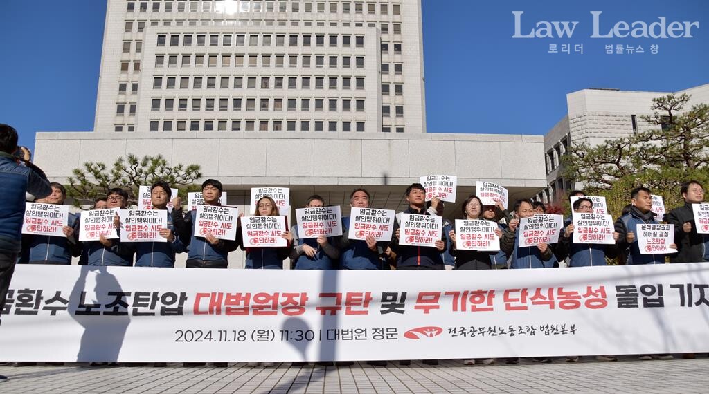 [로리더] 전국공무원노동조합 이해준 위원장은 법원행정처가 법원공무원노동조합 간부들에게 지급한 임금을 환수하려는 조치에 대해 “조희대 대법원장의 굴욕적인 판단으로 법원노조를 탄압하지 말고, 법원의 자존심을 지켜야 한다”고 강조했다.