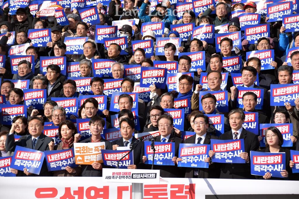 더불어민주당ㆍ조국혁신당ㆍ진보당ㆍ기본소득당ㆍ사회민주당 등 야 5당은 이날 정오(12시) 국회 본청 앞 계단에서 비상시국회의를 개최했다. 민주당이 주최한 비상시국회의에는 야 5당 국회의원들을 비롯해 시민들이 계단을 가득 채웠다.