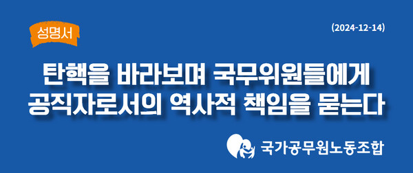 국가공무원노동조합은 “공직자로서 헌법과 법률을 준수하며 엄정한 역사의 평가 앞에 당당하고자 한다”며 “그러하기에 국무위원들에게 엄정한 역사적 책임을 물으며, 국민의 신뢰를 바탕으로 공정하고 책임 있는 공직사회를 만들어가는 데 최선을 다할 것”이라고 강조했다.