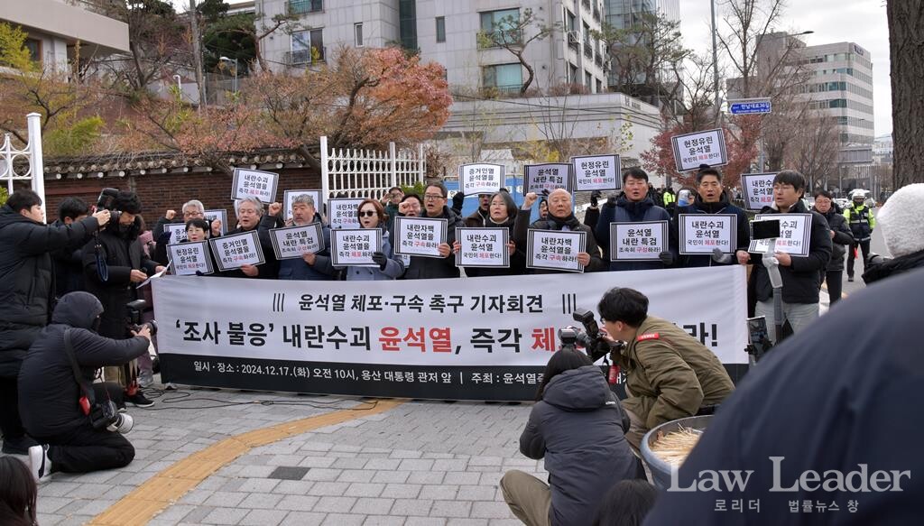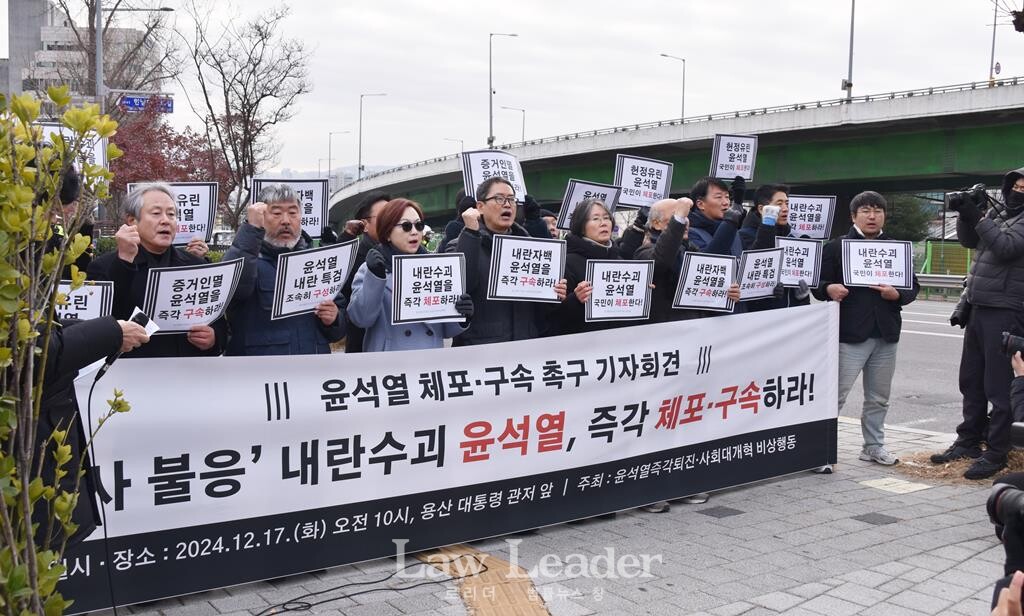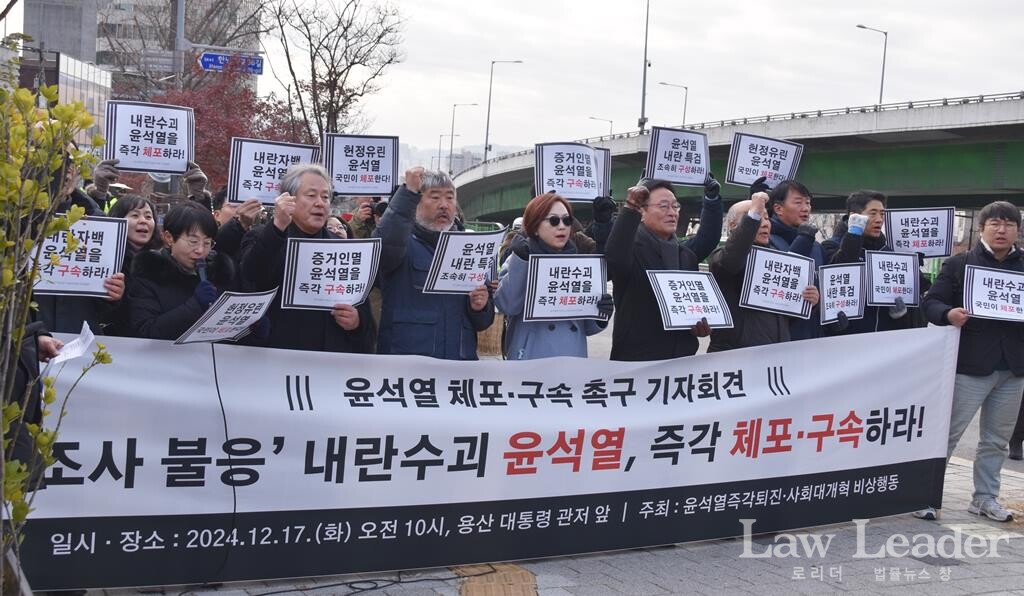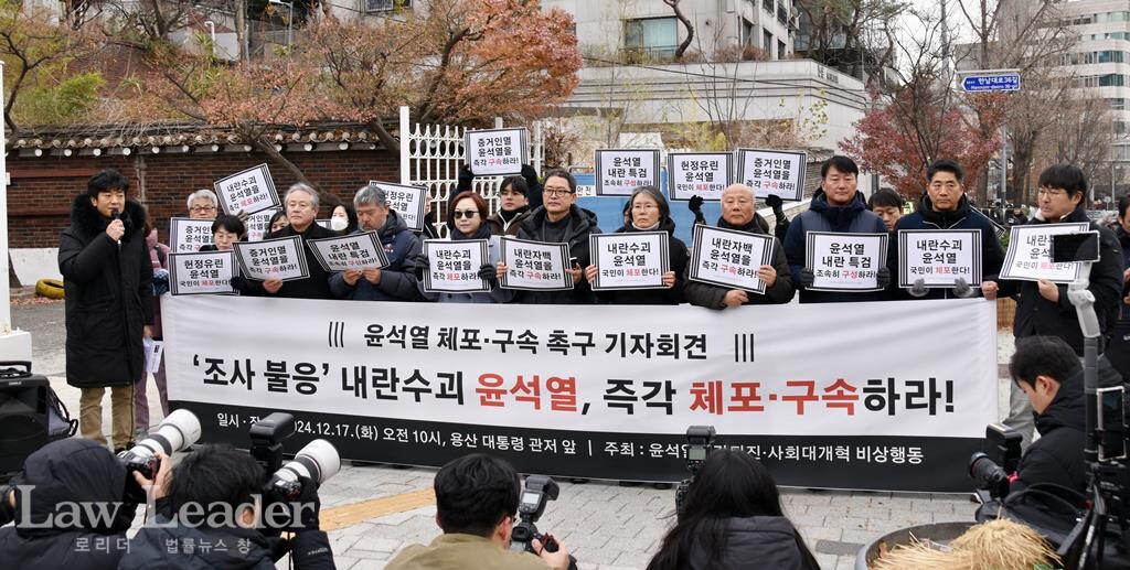 [로리더] 전국 1500여 단체로 구성된 ‘윤석열즉각퇴진ㆍ사회대개혁 비상행동’은 17일 오전 10시 한남동 대통령 관저 앞에서 “윤석열 체포ㆍ구속 촉구 기자회견”을 개최하고 다음과 같이 촉구했다.