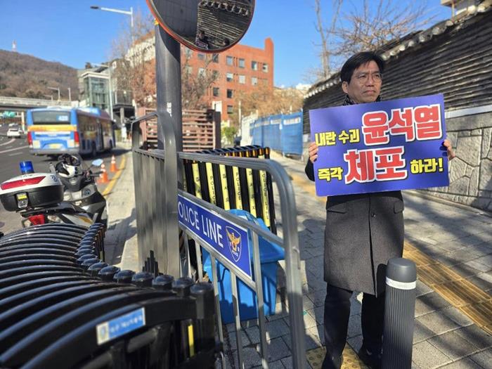 김남주 변호사는 23일 낮 12시부터 13시까지 한남동 대통령 공관 앞(한남대로 148 국제루터교회 앞)에서 “내란 수괴 윤석열 즉각 체포하라”는 피켓을 들고 1인 시위를 진행했다.