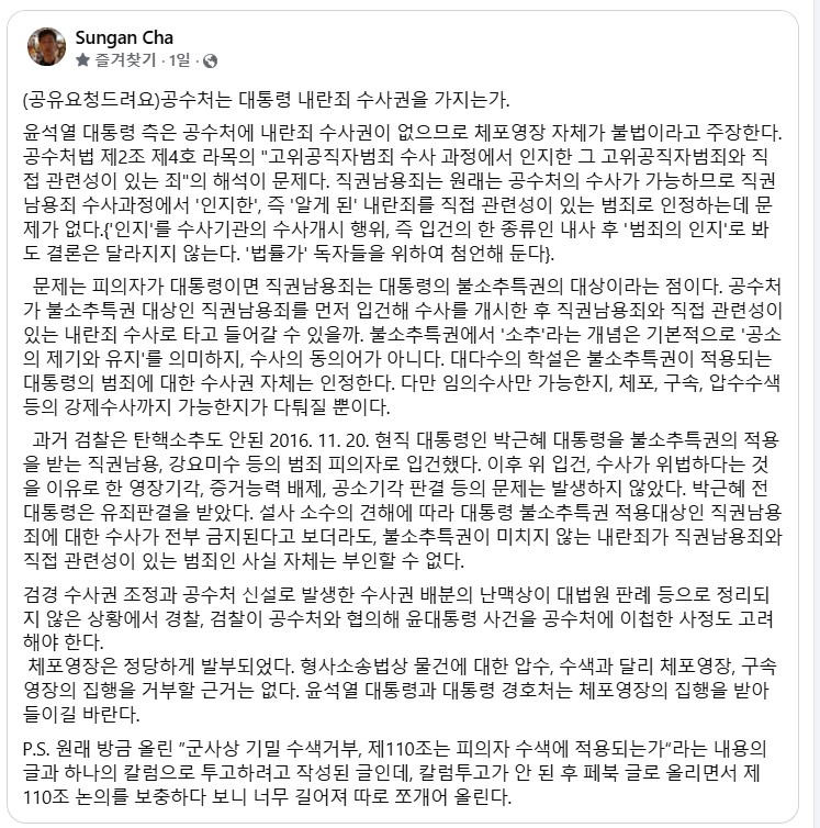 차성안 서울시립대 법학전문대학원(로스쿨, 로스쿨) 교수는 1일 페이스북에 <공수처는 대통령 내란죄 수사권을 가지는가>라는 글을 올렸다.