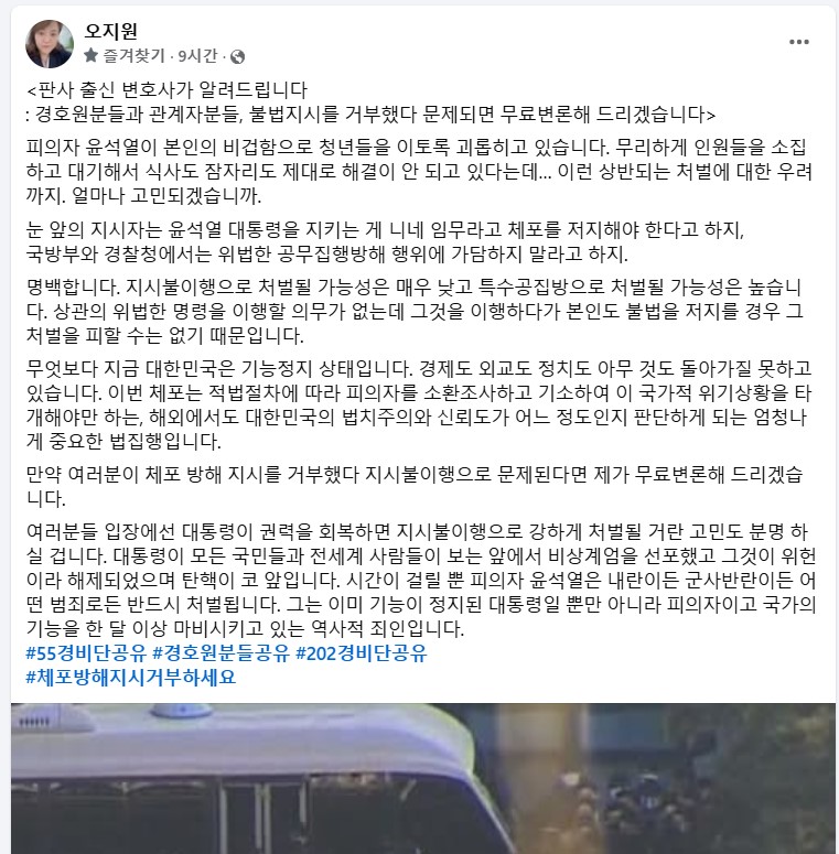[로리더] 수원지방법원 판사 출신 오지원 변호사는 12일 SNS(페이스북)에 <판사 출신 변호사가 알려드립니다 : 경호원분들과 관계자분들, 불법지시를 거부했다 문제되면 무료변론해 드리겠습니다>라는 글을 올렸다.