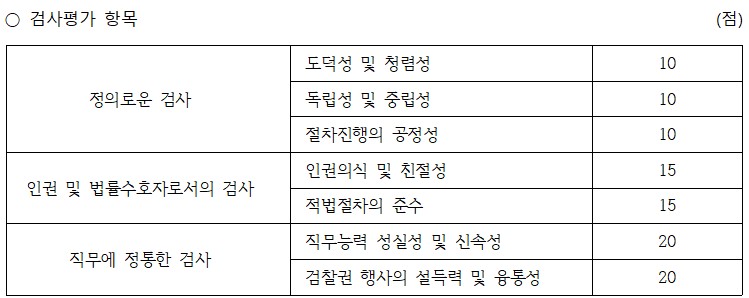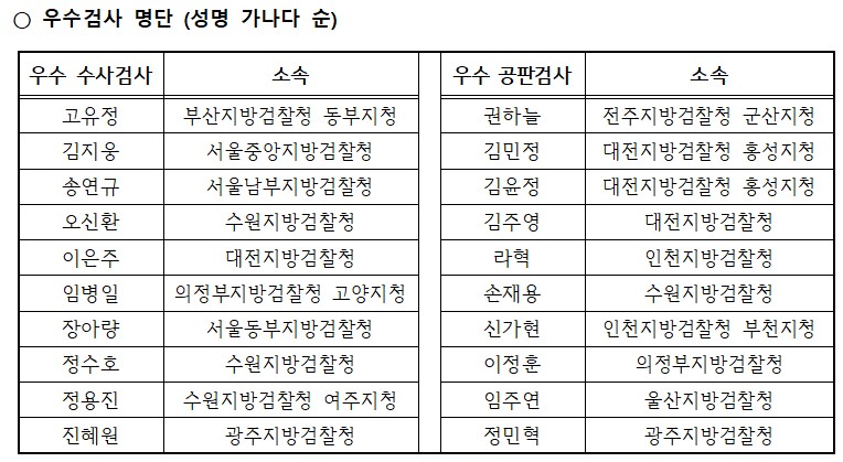 이와 함께 ‘하위검사’로는 최저점을 제외한 평가 평균점수가 80점 이하로 점수가 낮은 순위부터 10위 이내에 해당하는 검사에 해당하는 하위 수사검사 8명, 하위 공판검사 8명을 각각 선정했다.