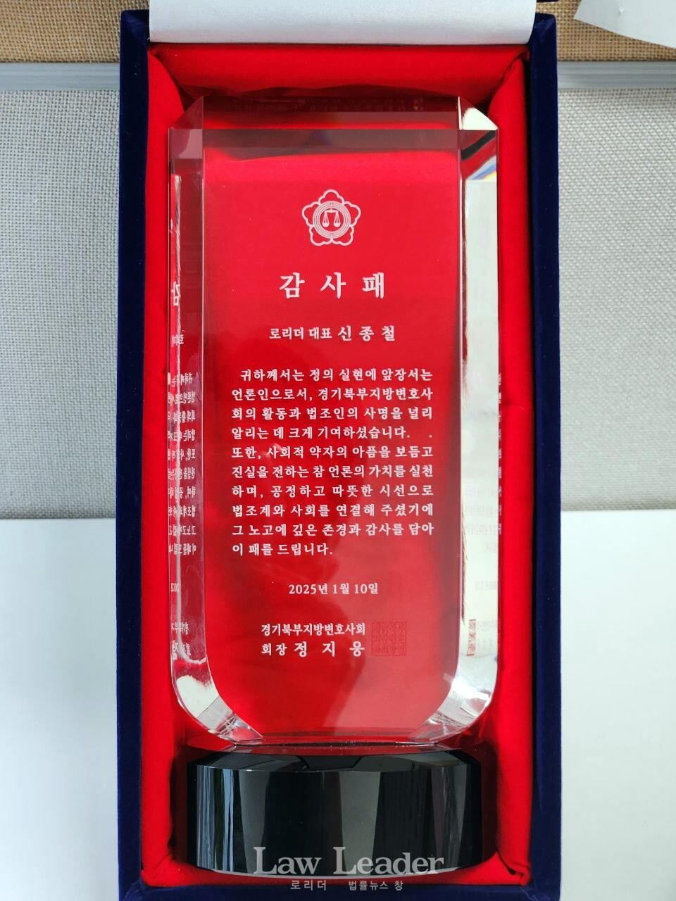 “귀하께서는 정의 실현에 앞장서는 언론인으로서, 경기북부지방변호사회의 활동과 법조인의 사명을 널리 알리는데 크게 기여하셨습니다. 또한, 사회적 약자의 아픔을 보듬고 진실을 전하는 참 언론의 가치를 실천하며, 공정하고 따뜻한 시선으로 법조계와 사회를 연결해 주셨기에 그 노고에 깊은 존경과 감사를 담아 이 패를 드립니다”