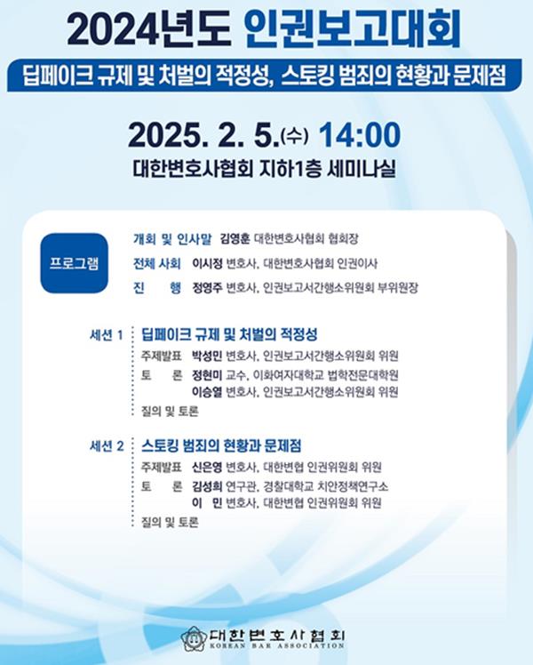 변협은 2013년부터 인권보고서 발간에 그치지 않고 한 해 동안의 인권상황을 조망하고 토론하는 의미에서 “인권보고대회”를 개최해 왔으며, 오는 2월 5일(수) 오후 2시, 서울 서초동 대한변호사협회 세미나실에서 “2024년도 인권보고대회”를 개최한다.