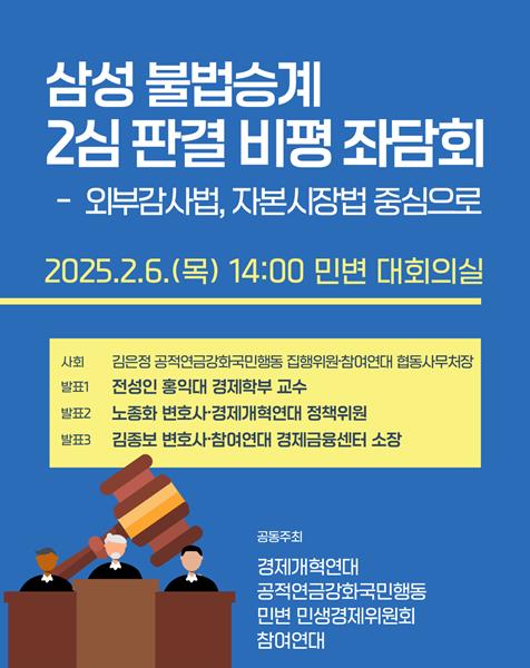 민변(민주사회를 위한 변호사모임), 참여연대, 경제개혁연대, 공적연금강화국민행동은 2월 6일 오후 2시 서울 서초동 민변 대회의실에서 2심 판결의 내용을 분석 및 평가하는 좌담회를 개최한다.