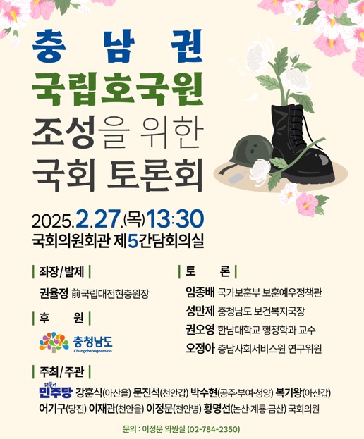 [로리더] 이정문 더불어민주당 국회의원을 비롯한 충남권 민주당 국회의원이 공동 주최하는 ‘충남권 국립호국원 조성을 위한 국회 토론회’가 2월 27일(목) 오후 1시 30분, 국회 의원회관 제5간담회의실에서 열린다.