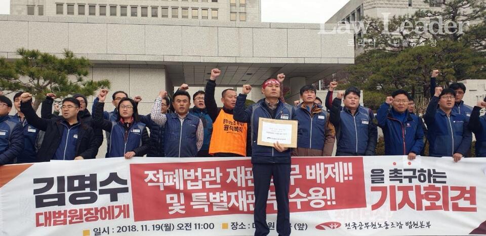 [로리더] 전국공무원노동조합 법원본부(본부장 조석제)는 19일 서울 서초동 대법원 정문 앞에서 ‘김명수 대법원장에게 적폐법관 재판업무 배제 및 특별재판부 수용을 촉구하는 기자회견’ 개최하고, 조석제 법원본부장의 삭발식을 거행했다.