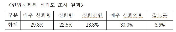 [로리더] 헌법재판소 결정이 늦어지면서 헌법재판관에 대한 신뢰도가 낮아진 것으로 나타났다.
