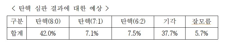 전체 응답자 중 42%는 8명 헌법재판관 전원 찬성으로 탄핵이 인용될 것으로 예상했다.