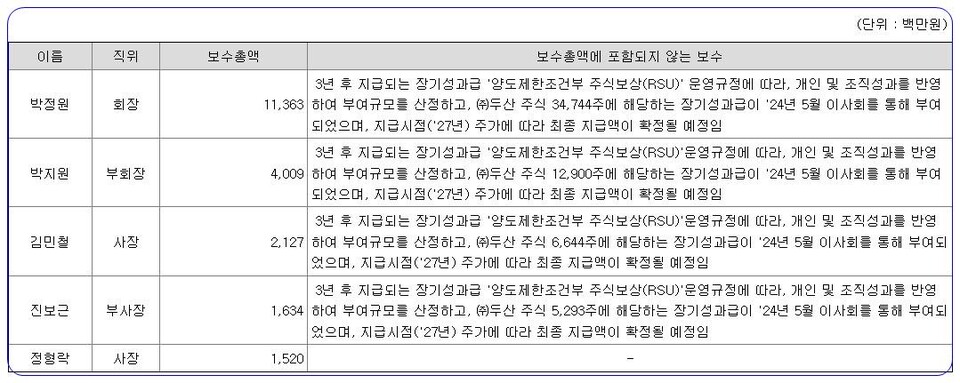 좋은기업지배구조연구소는 또 “미등기임원을 포함해 차상위 보수수령자는 지배주주 일가 박지원 부회장(미등기임원)으로 2024년 보수는 40억 900만원”이라며 “이는 전문경영인 사내이사들의 최소 2배 수준이며, 박지원 부회장은 RSU도 1만 2,900주(두산 주식)를 받았다”고 설명했다.