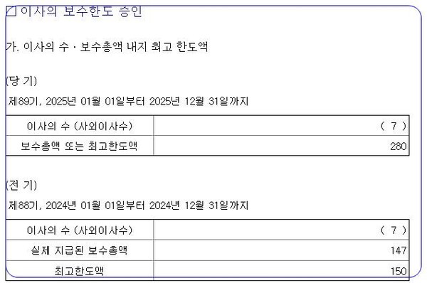 두산의 2024년 이사 보수한도는 150억원이었고, 이사들에게 실제로 지급된 보수총액은 147억 3700만원이었다. 그런데 2025년 이사 보수한도를 130억원 늘린 280억원으로 상정해 처리할 예정이다. 이사 수는 변동 없다.