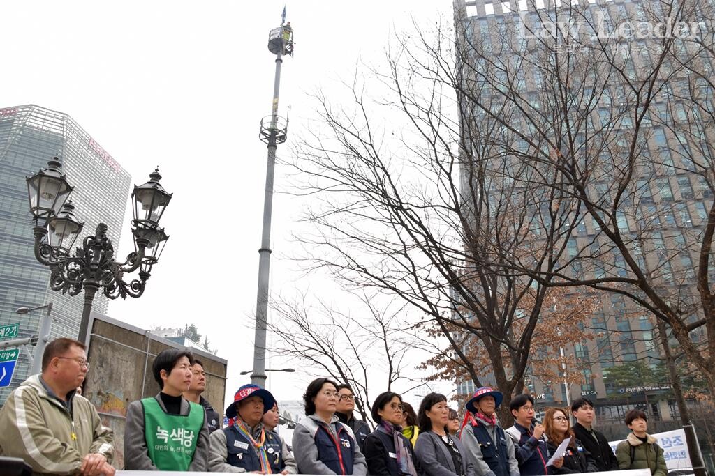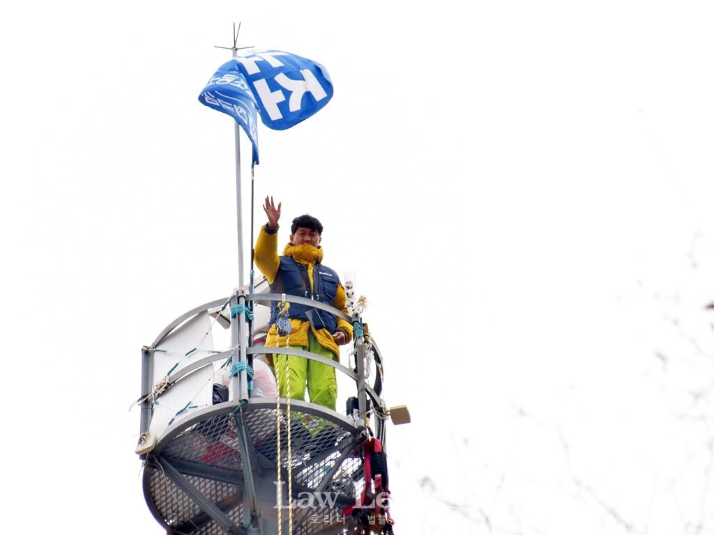 민주노총 서울본부와 너머서울은 25일 오전 10시 서울 중구 한화빌딩 앞, 김형수 거통고지회장이 고공농성 중인 CCTV 첨탑 앞에서 지지 기자회견을 개최했다. 김형수 지회장은 지난 3월 14일부터 ‘삭감된 상여금의 원상회복과 상용인력 확보’를 요구하며 고공농성을 시작했다.