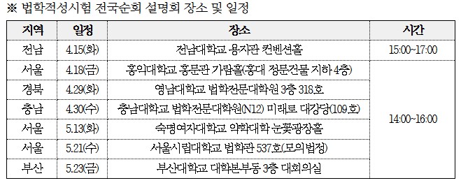 [로리더] 법학전문대학원협의회(이사장 홍대식)는 오는 4월 15일부터 5월 23일까지 전국 7개 대학교에서 ‘법학적성시험 전국순회 설명회’를 개최한다고 7일 밝혔다.