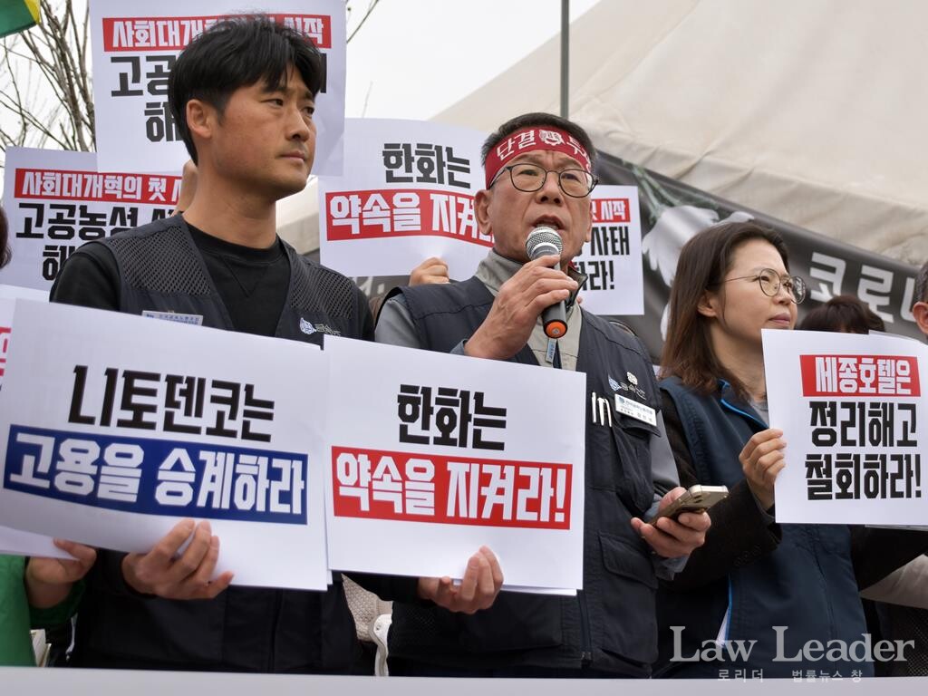 강인석 부지회장은 “한화오션은 법과 사용자성을 얘기하고 있는데, 사용자성은 요술방망이가 돼 그 어떤 요구도 사용자성을 가지고 모든 것을 무시하고 회피하고 외면하고 있다”면서 “노조법 2ㆍ3조는 한화의 가장 강력한 방호벽이 돼 버렸다. 이제는 바꿔야 한다”고 호소했다.