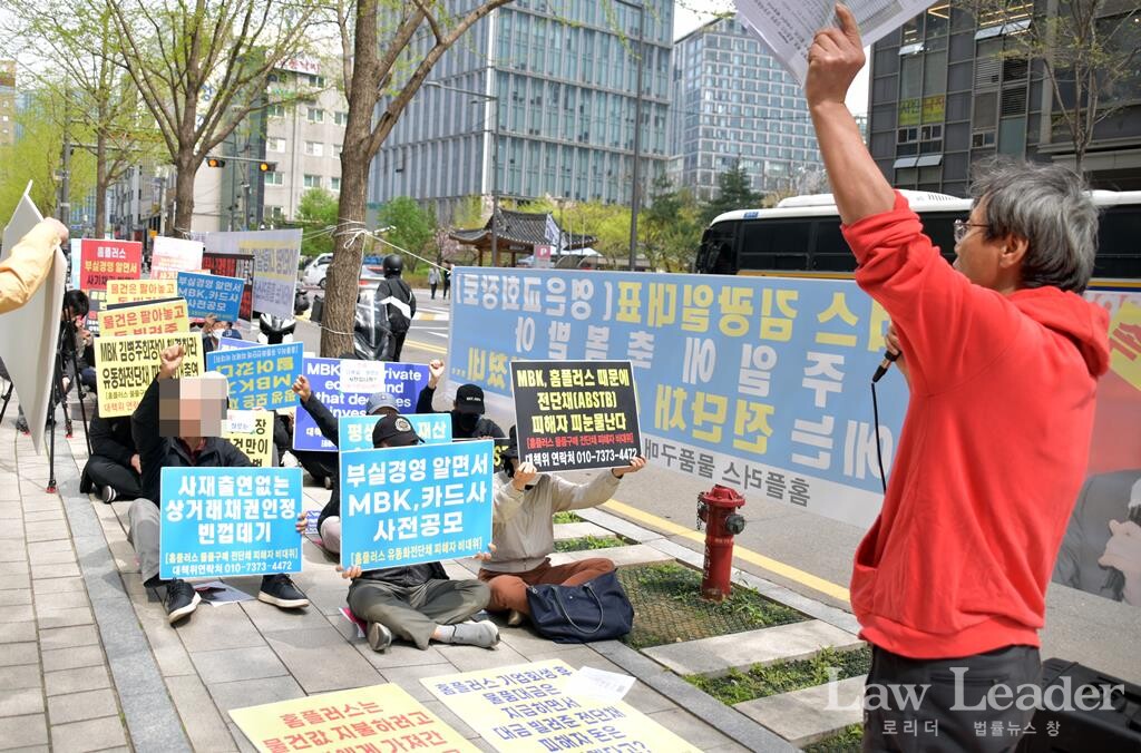 이의환 상황실장은 또한 “김병주 MBK 회장을 수배합니다. 도망 다니지 말고 사기채권 피해자 구제하라”는 전단지를 배포했다.